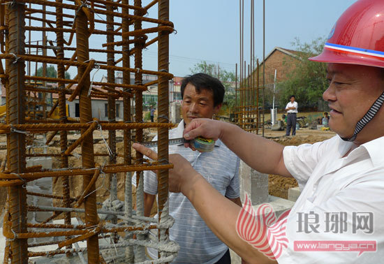 莒南县石莲子镇初级中学校长张定臣(右)在用尺子测量钢筋粗细