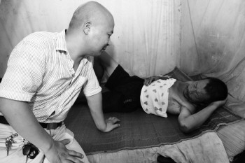 30日下午,看到扶起自己的好心人来到了家中,陈国爱抬起头称多亏了这位好心人将他扶起来,现在自己感觉已经好多了。