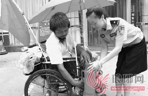 30日下午,杨兴坐着轮椅来到市区银雀山派出所,并拿出一个红色暖瓶向民警“讨”水喝。趁着民警为其烧水的空,记者与他交流起来。杨兴整理了一下插在轮椅后面的国旗,说:“我是郯城人,今年43岁,为了迎接伦敦奥运,宣扬奥运精神,我从7月13日就离家开始了全国游。”出行前,他还专门买了一份地图,“我感觉‘州’和‘阳’两个字很大气,而且祖国很多地方的地名都带这两个字,因此我决定把带有这两个字的300多个城市全部走上一遍。”杨兴说,离开临沂后,他下一站就是胶州和海阳,然后一路北上,以此来迎接伦敦奥运,也向家人证明自己的意志。