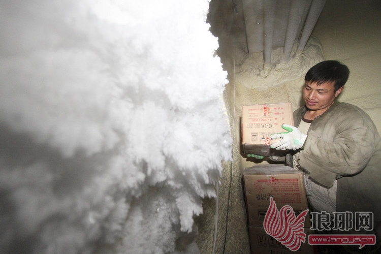 冷库有两层,都摆放着成片的雪糕箱,屋顶上挂着洁白的冰凌。外边是34℃的桑拿天,走几步就得热出一身汗;冷库里却是-15℃的严寒,进来得穿着棉衣棉裤,内外温差达到50多摄氏度。