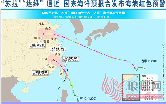 国家气象中心台风与海洋气象预报中心副主任张长安说,双台风“苏拉”、“达维”联袂夹击将持续到5日左右,将影响我国10多个省份。“苏拉”台风中心经过的附近海域的最大风力有11-13级,阵风可达14-15级;“达维”中心经过的海域,最大阵风可达13-14级。