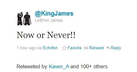 经历了一天多煎熬,詹姆斯就算在训练中带着笑容也可以看出他处在非常阶段,因为那种笑很明显是对媒体做的。还好,詹姆斯没有倒下,面对压力,一种情况是一蹶不振,另一种情况是奋发图强。就算谩骂的人再多,詹姆斯也要挺起脊梁持续战斗。这次在午夜做出宣言,就是詹姆斯最有力的回应:Now or Never!!恰与莎士比亚笔下的经典——To be or not to be(生存或毁灭)暗合。