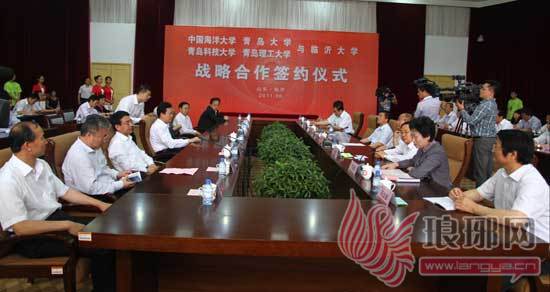 琅琊网6月9日讯(记者 何金洧)9日下午,中国海洋大学、青岛大学、青岛科技大学和青岛理工大学四所青岛高校与临沂大学战略合作签约仪式举行。山东省委常委、青岛市委书记李群出席并讲话,美国马里兰大学原副校长、香港科技大学原副校长孔宪铎,青岛市委常委、秘书长王鲁明,中国海洋大学党委书记于志刚,青岛大学党委书记夏临华,青岛科技大学党委书记高青,青岛理工大学校长仪垂杰,市领导张少军、申长友、李峰等出席。市委书记、市人大常委会主任张少军致辞,临沂大学党委书记丁凤云主持并简要介绍大学发展情况,临沂大学校长韩延明代表大学与四高校签约。