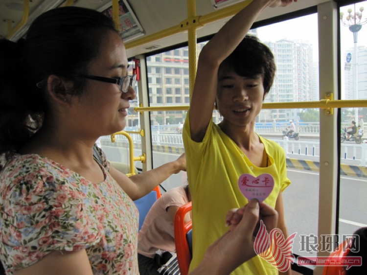 “您好,我是市公交总公司的志愿者。为了对您主动让座文明行为的肯定,送您一张爱心卡。凭卡可免费乘车一次。”7日上午9点25分,公交公司志愿者送给爱心市民一张爱心卡。