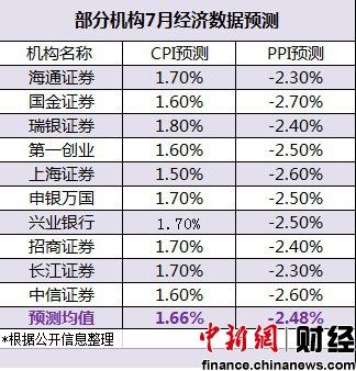 10家金融机构预测7月CPI同比涨幅均跌破2%,其预测均值为1.66%
