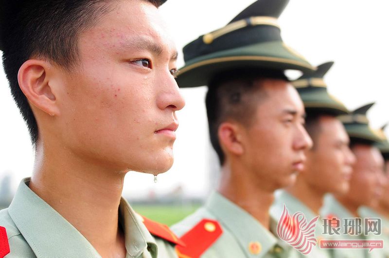 烈日酷暑,战士脸颊滴下的汗水证明这不是一尊雕塑。