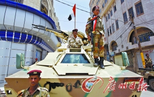 一部分倒向反对派的也门士兵在萨那街头巡逻。