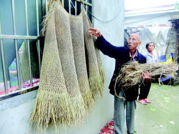 朱保朝说,尽管编蓑衣是件很辛苦的事情,可为了养家糊口,他家已有祖孙三代人以编蓑衣为生。早在十四五岁的时侯,他就随爷爷、父亲一起学编蓑衣,只要不是农忙,他们家便夏秋天割草,冬春天编织,以此维持生计,编蓑衣的技术是他们几代人的传家宝。