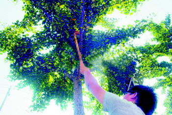 记者看到,前来采摘的市民还有几位。李女士踮着脚尖,左手压弯树枝,右手不停地摘银杏果。李女士告诉记者,她老公有高血压,听说吃银杏可以软化血管、对身体有好处。虽说银杏果还不熟,但看到别人都在摘,李女士也就加入了采摘的行列。