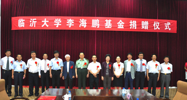 为庆祝临沂大学70华诞,6月10日,临沂大学优秀校友、山东鹏宇集团董事长李海鹏向母校捐赠一千万元成立海鹏基金,用于推动母校前沿学科发展,支持母校大学生自主创业,为母校70华诞献上了一份厚礼。中国人民解放军国防大学原副政委、将军李殿仁,香港科技大学原副校长孔宪铎,山东省科技厅副厅长、青岛国家海洋科学研究中心主任李乃胜,山东省文化厅正厅级巡视员邢玉斗,临沂市委常委、宣传部长李建华,鹏宇集团董事长李海鹏,鹏宇集团总经理孙伟强,临沂市文广新局局长郑西溪,临沂市科技局党组副书记、科学技术合作与应用研究院院长沈如茂,临沂大学党委书记丁凤云,校长韩延明,党委副书记、纪委书记石立岩,党委副书记谢亚非,副校长李培江、姜同松、王勇、李富山出席基金捐赠仪式。韩延明代表学校与李海鹏签署了捐赠协议书,接收了李海鹏捐赠基金,向李海鹏颁发了基金捐赠证书。捐赠仪式由姜同松主持。