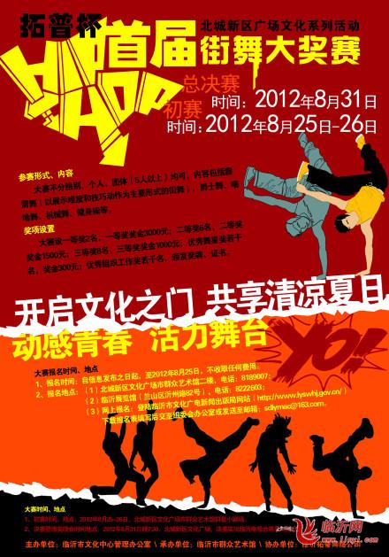 临沂网讯 由临沂市文化中心管理办公室主办、临沂市拓普网络有限公司协办的“拓普杯”首届街舞大奖赛即将开赛,欢迎广大街舞爱好者前来免费报名参赛。本届街舞大赛以“动感青春、活力舞台”为主题,以“开启文化之门、共享清凉夏日—北城新区首届广场文化艺术节”为平台,着力打造一台别开生面、激情飞扬、魅力四射的艺术盛会,为青少年群体开拓一个张扬自我个性、挥洒青春活力的自由空间,丰富群众文化生活,铸造北城文化新高地。