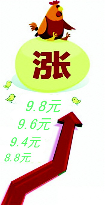 杨先生介绍,近期鸡蛋价格很不稳定,进价几乎一天一涨,上周零售价还保持在8.4元/公斤的价格,现在已经涨到了9.6元/公斤。21日,记者走访了市区大润发、银座等超市和站前、齐鲁农贸市场后了解到,个别市场鸡蛋零售价已经涨至9.8元/公斤,而且还有继续上涨的趋势,估计很快就会突破10元/公斤大关了。
