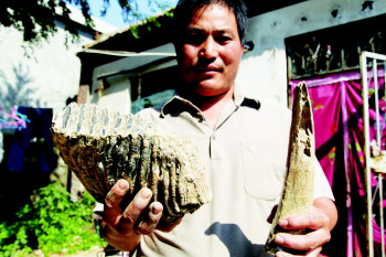 ▲宋凤军展示他所捡到的古菱齿象象牙化石(左)和獠牙化石(右)。