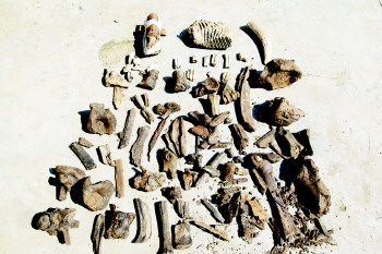 ◤宋凤军捡到的化石中有象牙、脊椎骨、股骨、肋骨的化石。