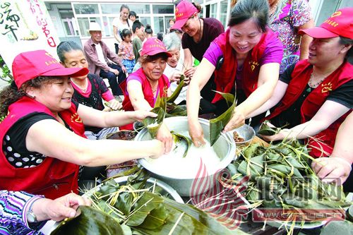 志愿者在兰山街道曹王庄社区敬老院与老人一起包粽子。