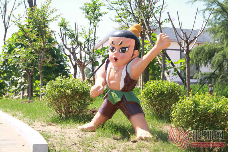 循着潺潺流水声,园区右侧是用竹子搭成的葫芦花架,花架上已爬满了青翠的葫芦叶,一两个毛茸茸的小葫芦藏在其间。顺着葫芦花架长廊往园区内走,三个色彩鲜艳的金刚葫芦娃分布在道路的两侧,活灵活现的造型,异常惹人喜爱。