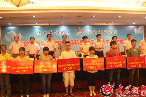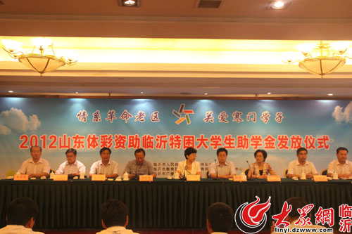 8月28日,“情系革命老区 关爱寒门学子”2012山东体彩资助临沂特困大学生助学金发放仪式在临沂市荣华大酒店隆重举行今年的沂蒙爱心助学活动于8月10日启动后,公开接受临沂地区贫困家庭学生的助学金申请,通过申请、推荐等,临沂市教育局及有关部门严格筛选,最终确定了100名品学兼优却又无力承担学费的大学新生作为资助对象,每人获得山东体彩提供的4000元爱心助学金。