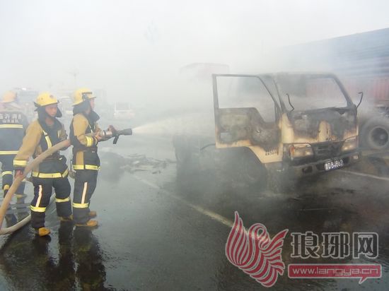 据目击者付先生介绍,事发时,他看到该货车的驾驶室突然起火,然后整个货车开始燃烧,火势一度很大。“车上装的是纸箱,很容易着火。”付先生告诉记者,他估计是发动机着火了,驾驶员和副驾驶发现后,马上从车上跳下来。“他们下车后就拨打了119电话,消防人员很快就赶来灭了火。”