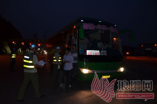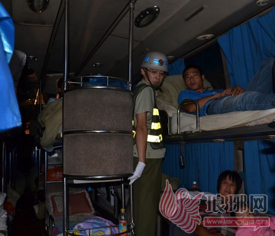 5日晚上6点,交通稽查执法人员正在对卧铺客车进行检查。