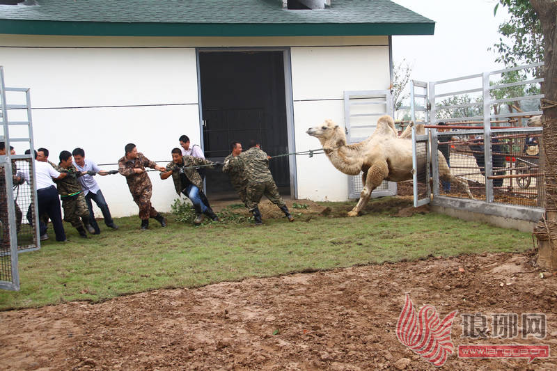 随着工作人员将绳索套在“骆驼王”的脖子上,一场人VS骆驼的拔河比赛精彩上演,十几名大汉用粗粗的绳索套着骆驼一步一步往前拉,可骆驼的脚仿佛像钉子一样钉在车上,无论工作人员怎么拉它就是一动不动,工作人员只好采取消耗战,待将骆驼的力气耗尽之后,才趁势将它拽下车。经过了一小时的“对决”,骆驼们被陆续请入新家,开始了新的生活。