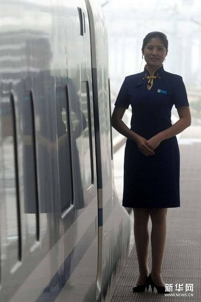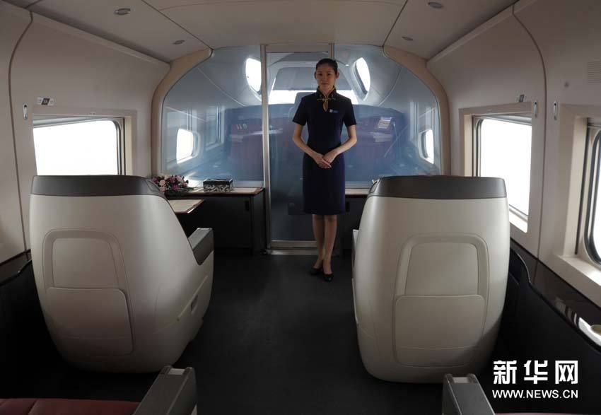 6月12日,参加试运行的京沪高铁VIP观光车厢女乘务员。