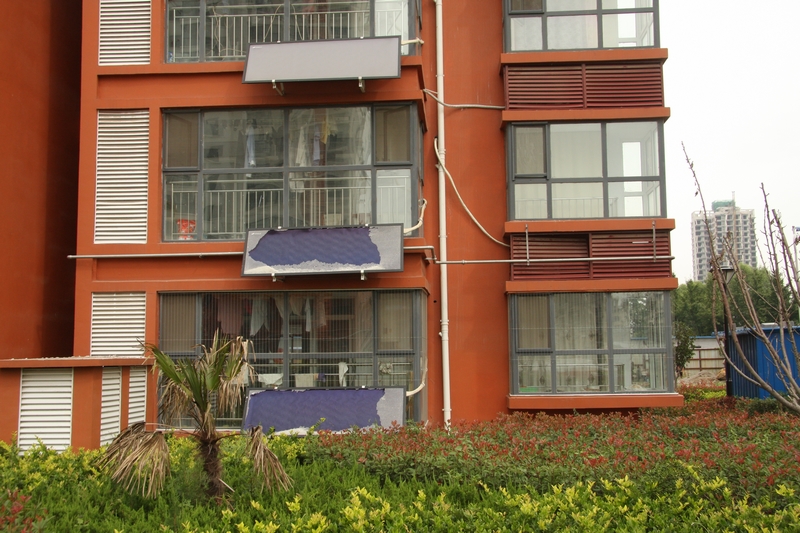 上午10时许,记者来到该小区。在小区居民的指引下,记者看到小区一栋楼前的阳台外挂太阳能集热板有几个出现了不同程度的毁坏,有的出现了一个大窟窿,有的玻璃全无,楼下花坛里还残留着一些玻璃碎渣。“被砸坏的是15楼、11楼、7楼、2楼、1楼五个楼层的太阳能,这些都是38号楼一单元的住户。”该居民说。