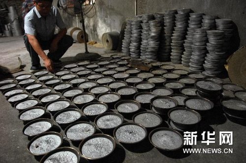 这是被关停的一间作坊内摆放在地上的掺有铅的锡盘(6月9日摄)。