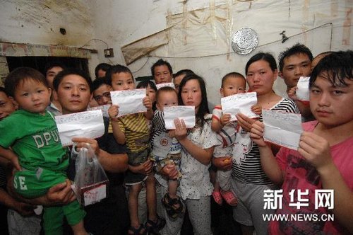 6月9日,来自四川宜宾、在绍兴县杨汛桥镇江桃村从事锡箔加工的外来务工人员及子女手持各自的血铅化验单。