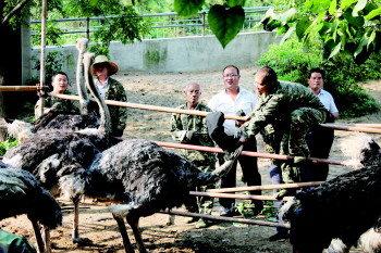 为了防止鸵鸟踢人,工作人员先在鸵鸟园里围成一个半圈,站在鸵鸟面前。有人拿着扫帚,有人挥动树杈,先把鸵鸟赶到一起,然后慢慢向出口靠近。“鸵鸟有从众心理。如果有一只鸵鸟敢先试试水,其他的鸵鸟觉得没有危险了,就会跟过去。”一名饲养员说。
