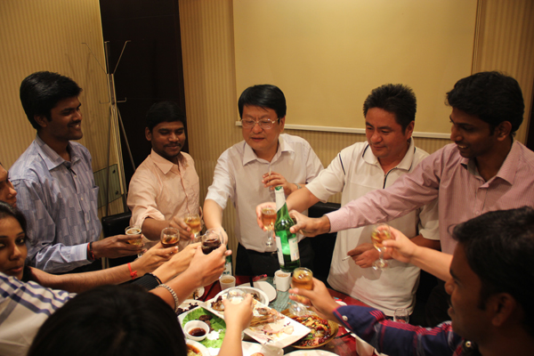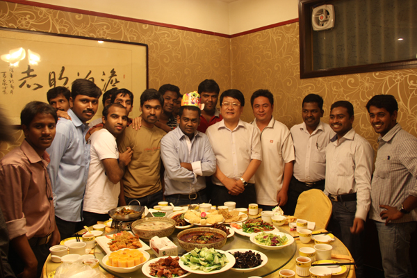 临沂网讯 2012年9月15日,是印度籍员工Ratha24周岁生日,也是售前支持部林立斌举行新婚喜宴的日子。这天,拓普网络公司总经理王岚保、特邀嘉宾郑科长和公司100余名中印员工欢聚一堂,为他们庆祝祝福。在此刻,没有国界,现场气氛欢乐融洽,爱和微笑让大家的心紧紧相连在一起。