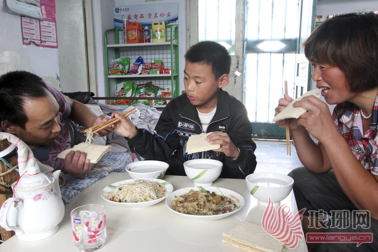 两盘青菜便是这个三口之家的午餐,图为小富裕给父亲夹菜。 记者 廖杰 摄