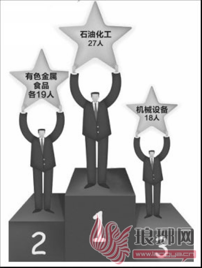 山东前150位富豪,27位出自石油化工行业,其次为有色金属业和食品业,均造就了19位富豪,机械设备业紧随其后,产生了18位富豪,这与山东工业分布特点高度吻合,石油化工、有色金属、食品和机械设备行业成为富豪高度集中的产业。