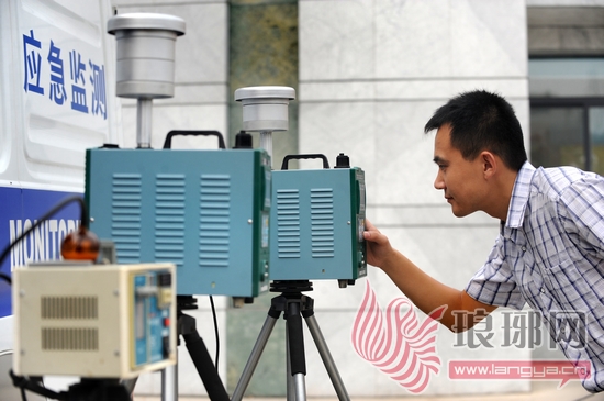 环保监测人员在人工监测点调整监测仪器。 记者车明军 金成远 摄