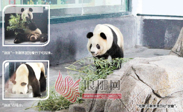 来到动植物园大熊猫馆的新家,“龙腾”第一个进入馆舍,因为人生地不熟,“龙腾”一直在馆舍四处踱步,面对新鲜的竹叶丝毫不愿触碰。而随后进入馆舍的“迪迪”可大不一样,在绕场一周后,安静地喝了几口水,然后一屁股坐在假山前,抓起身边的竹子,当着众多记者的镜头大吃特吃起来,时而还冲着镜头摆个造型,颇具明星范儿的动作,把所有在场的人都逗乐了。