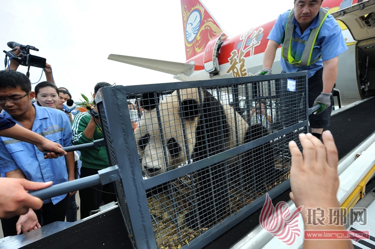 10点38分,在乘客的行李全部卸下后,工作人员将装“迪迪”和“龙腾”的笼子抬上输送履带,两位“大明星”在摄像机、照相机的包围中沿着履带坡道慢慢转至提前准备好的运输车上。在人们的欢呼声中,装载着两位“贵宾”的运输车驶往它们在临沂动植物园的新家。