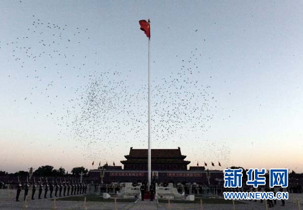 在他们面前,五星红旗迎风飘扬,1万只象征和平、吉祥的和平鸽放飞蓝天,将祖国心脏的欢乐信息传递到四面八方。