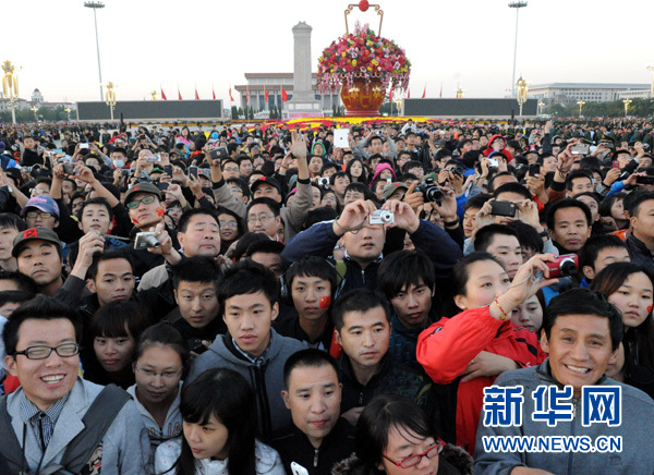 10月1日,群众在天安门广场观看升国旗仪式。当日,来自全国各地的数万名群众聚会北京天安门广场,观看升国旗仪式。 新华社记者唐召明摄