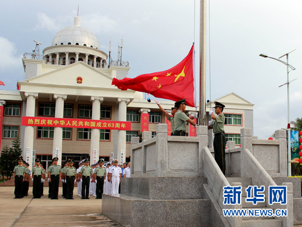 这是10月1日拍摄的三沙市国庆升旗仪式。当日清晨,海南省三沙市成立以来第一次国庆升旗仪式在永兴岛举行,三沙市军民齐聚市委、市政府楼前广场,共同祝福共和国的第63个生日。新华社记者 毛鹏飞 摄