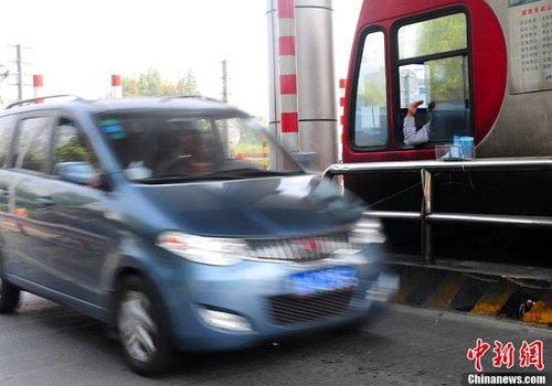 10月4日12时起,全国各高速公路出入口对符合免费政策的七座及以下小型客车不再采取发卡措施,直接抬杆放行。图为4日,浙江杭州绕城高速收费站工作人员对符合免费政策的汽车直接抬杆,挥手示意直接通过。周炜 摄 东方IC 版权作品 请勿转载