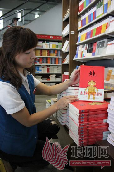 在工作人员的帮助下,记者在靠近楼梯的一个展台上,找到了莫言获得第八届茅盾文学奖的作品《蛙》。工作人员介绍,莫言的作品去年刚获奖的时候有很多人来询问、购买,当时书店购进471本,但是到现在还剩余89本,一直摆在角落里。