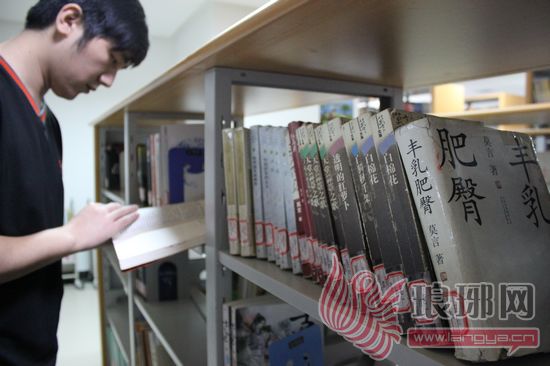 图书馆中文社科借阅室刘主任介绍,莫言的作品一直很受欢迎,特别是《红高粱家族》、《丰乳肥臀》、《檀香刑》、《蛙》等经典作品,有些书借出次数太多,不得不留下修补。