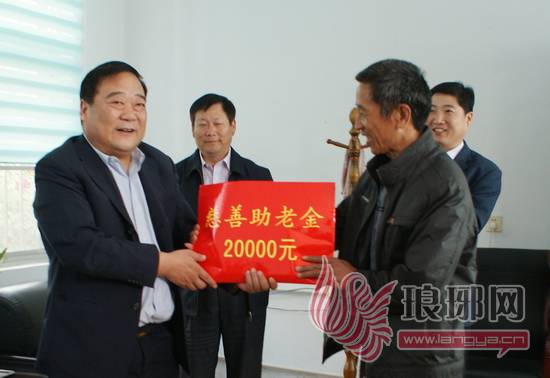 市慈善总会会长张闻宇(左一),为敬老院送上慈善助老金。