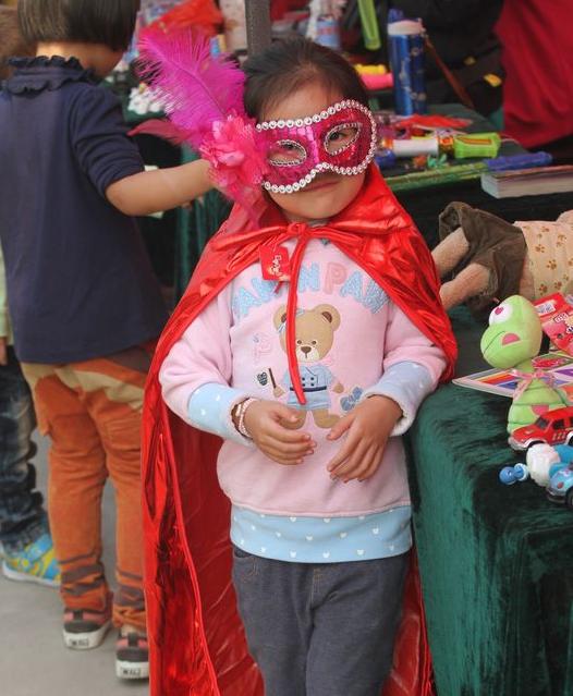 一位小摊主为提高自己摊位的销量,带起了面具,穿起了披风。