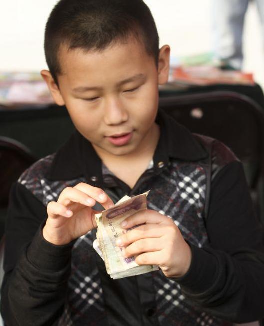 一位小朋友认真地数着交易挣来的钱。