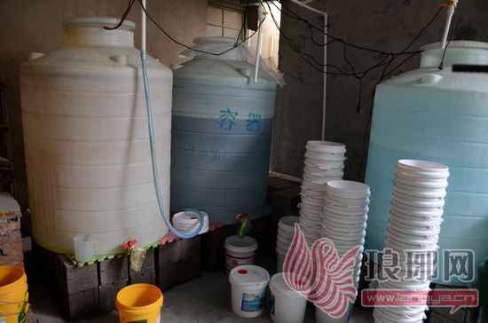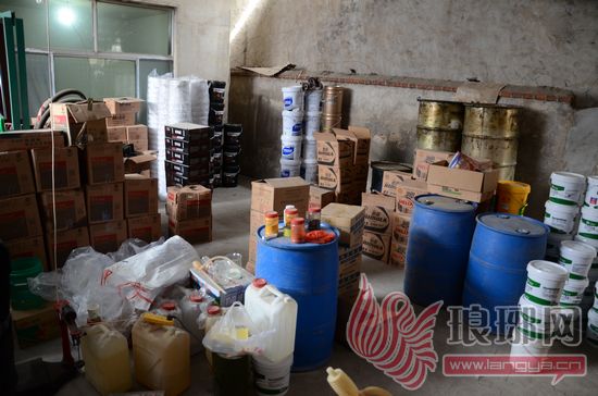 22日上午,市质监局稽查局的执法人员接到群众举报,称在其村子某院里有人在加工假名牌防冻液。随后,记者随同执法人员一起赶到了涑河南街响河屯村,根据举报电话提供的地址,找到了该“加工厂”。从外观上看,这个“加工厂”和周围房子没有任何异样,而推门后却看到堆积如山的桶装防冻液。其中,不少已经是加工好的“成品”,有的还正在灌装。在旁边还散放着大量的未灌装的空塑料桶,包装纸,及各种色素,而这些就是生产“名牌”防冻液的主要材料。