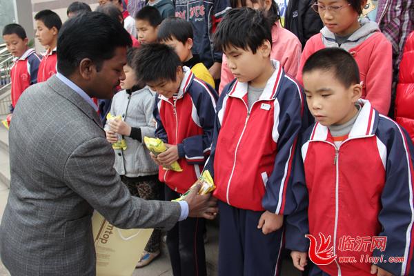 “临沂市荣誉市民”BABU为孩子们发饼干和火腿肠
