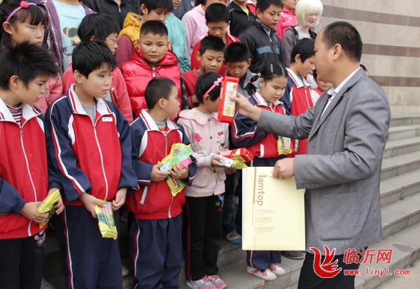 临沂市拓普网络有限公司刘瑞军经理为孩子们发饼干。