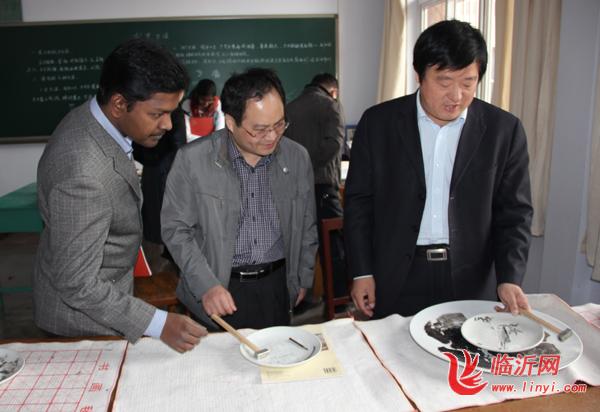 临沂市拓普网络有限公司印度专家BABU、张金刚经理和学校校长一起参观学生的刻瓷作品。