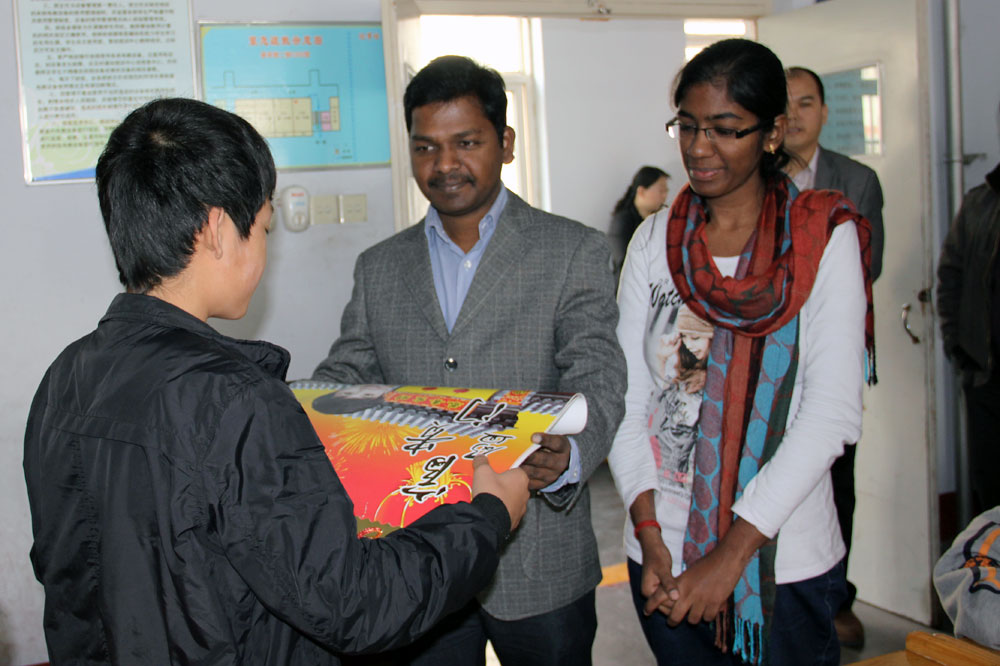 印度籍软件专家BABU(左二)与kamalam(右一)向同学们赠送挂历书写纸。