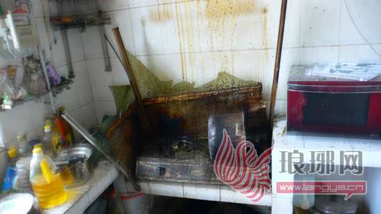 记者在闫女士家里的厨房看到,地面、墙上和灶台上全是散落的粥,抽油烟机机罩被炸飞,玻璃散落一地,高压锅盖掉落在地上,高压锅已变黑“躺”在煤气灶上。